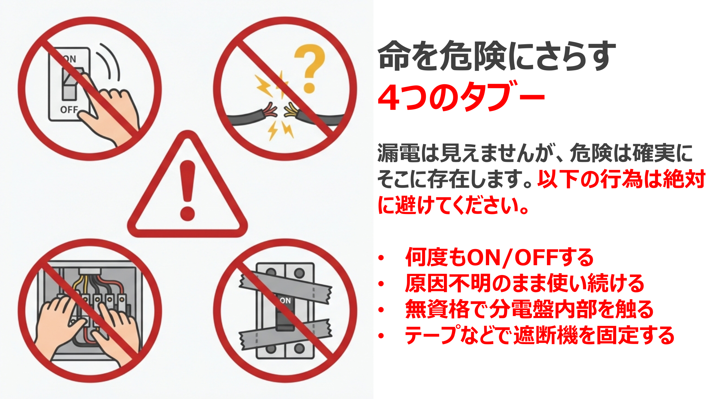 漏電は目に見えません。しかし、確実に危険を伴います。自己判断での無理な対応は、重大事故につながる可能性があります。