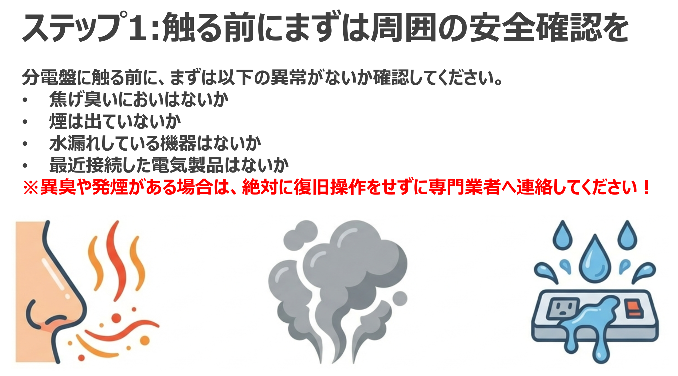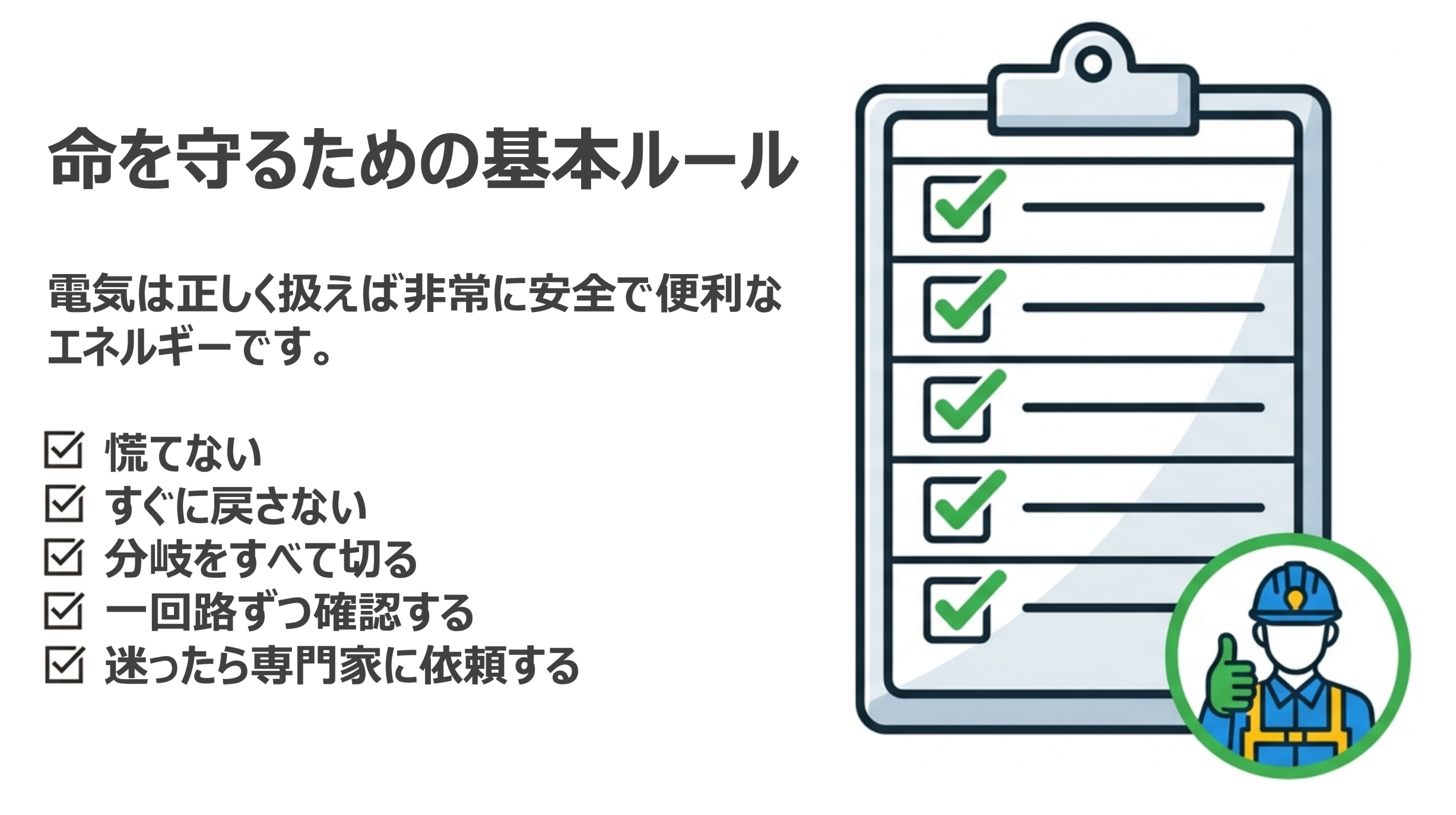 電気は便利で安全なエネルギーですが、それは正しい知識と適切な対応があってこそ成り立ちます。万が一の際に慌てないためにも、正しい復旧手順を理解しておきましょう。