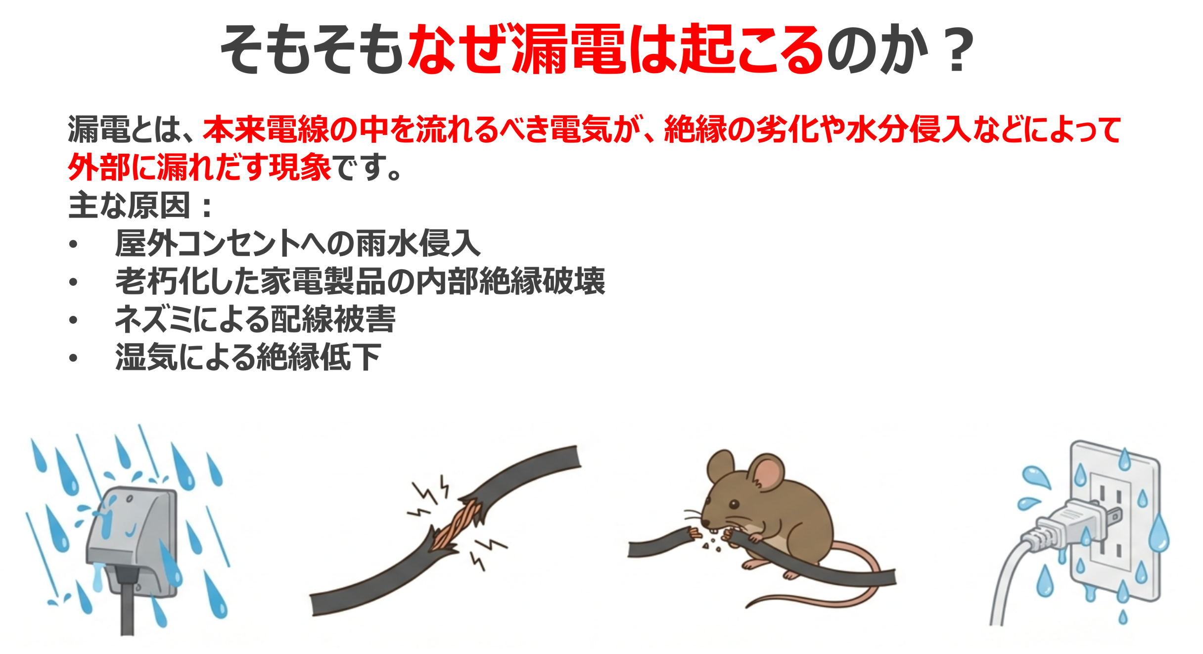 漏電とは、本来電線の中を流れるはずの電気が、絶縁劣化や水分の侵入などによって外部に漏れ出してしまう現象です。