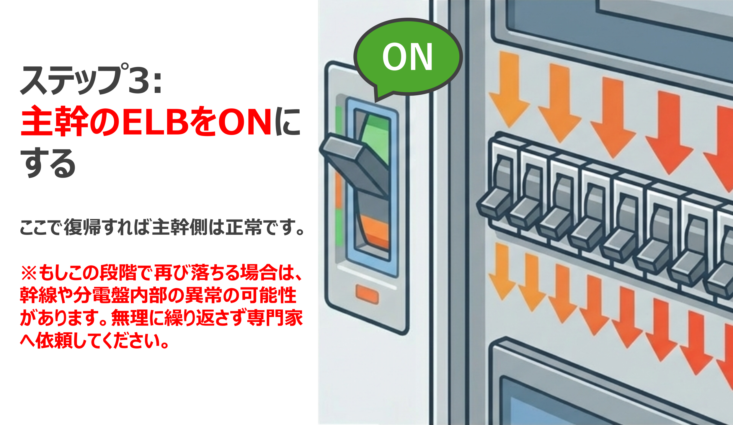 この時点で再び落ちる場合は、幹線や分電盤内部の異常が疑われます。無理に操作を繰り返さず、専門家に依頼してください。