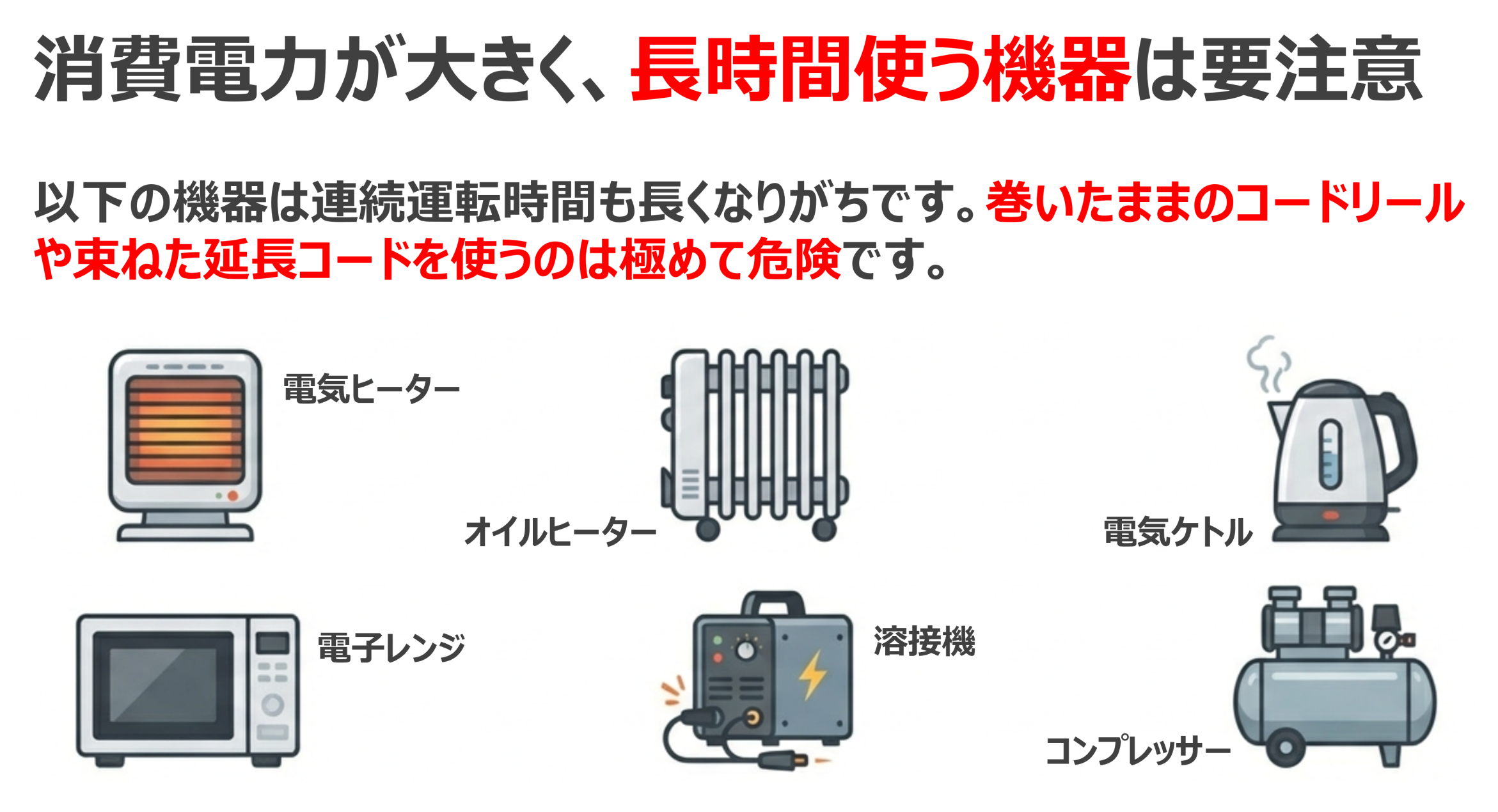 以下の家電は消費電力が大きく、連続して長時間使うことが多いため、巻いたままのコードリールや束ねた延長コードでの使用は極めて危険です。