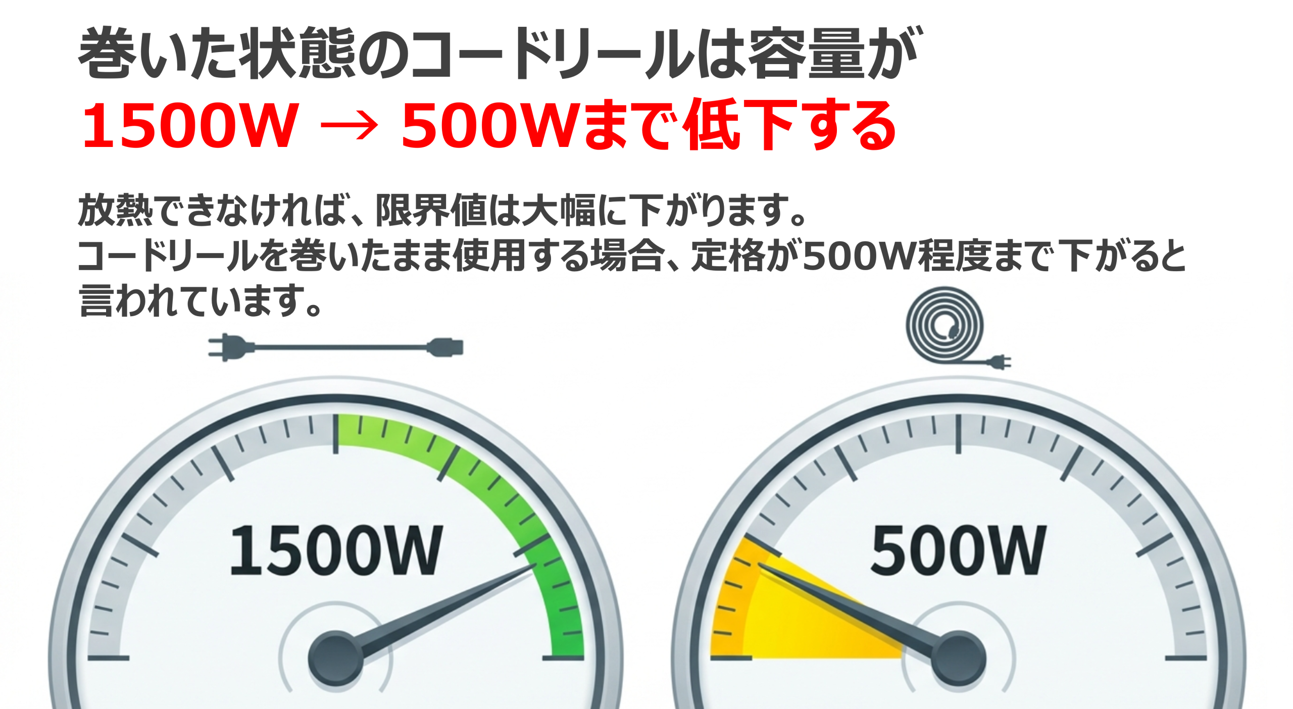 実際、メーカーの注意喚起によれば、コードリールを巻いたまま使用する場合、安全に使用できる容量は「500ワット程度」まで下がるケースもあります。