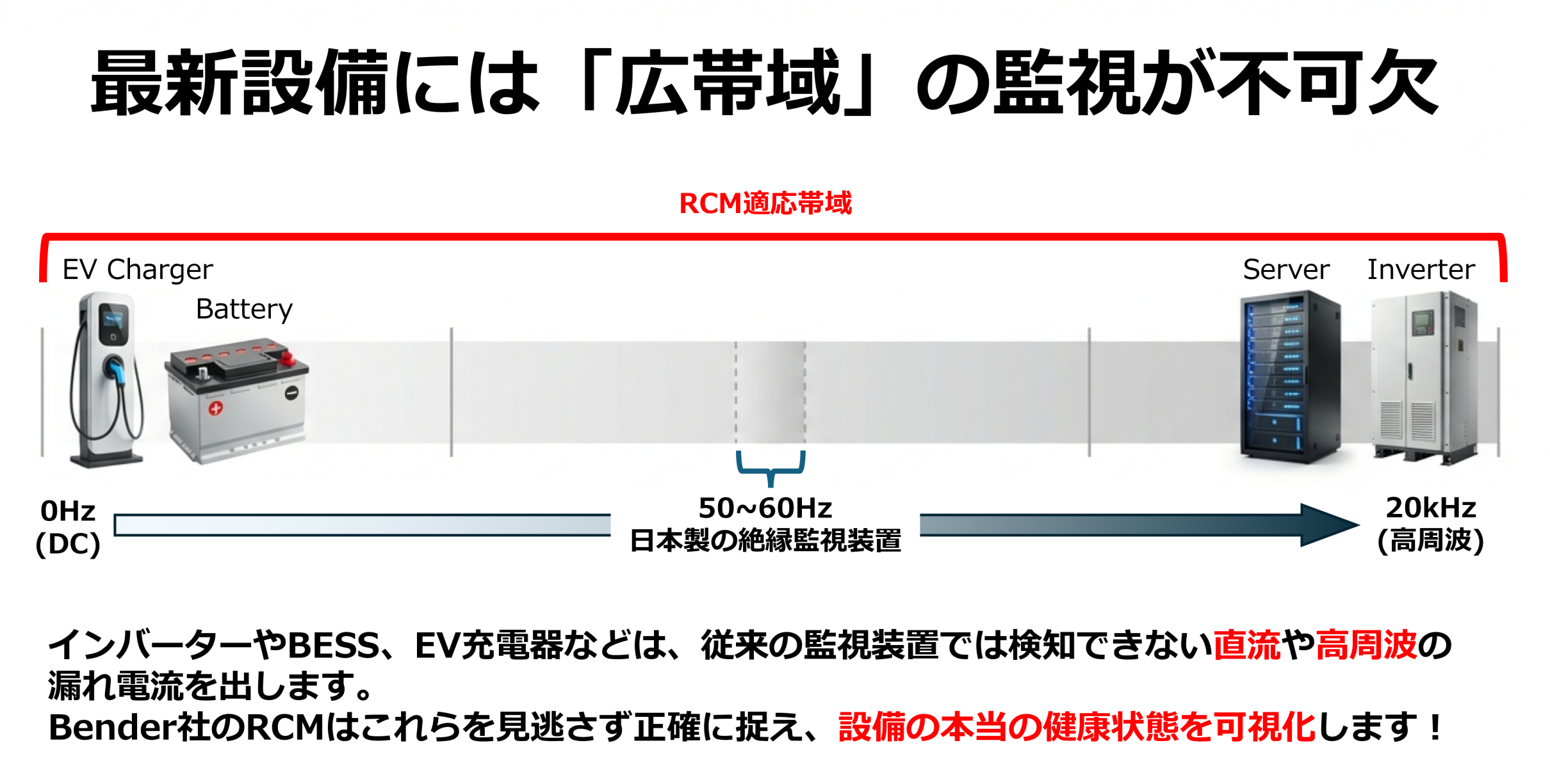 対して、Bender社のRCMは、0Hz(直流:DC)から20,000Hz(20kHz)という極めて広い範囲を監視できます。