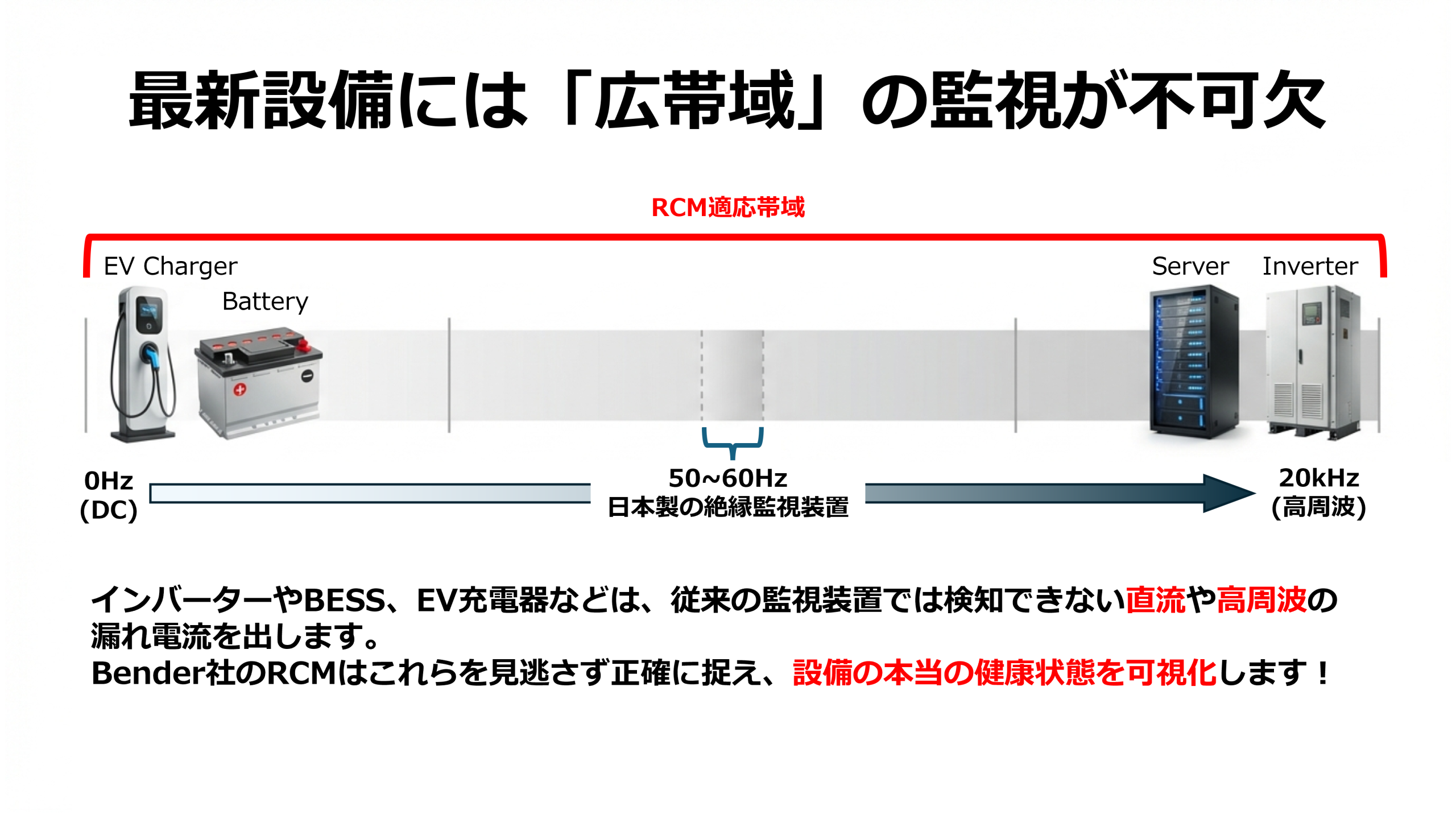 「うちは既に絶縁監視装置を入れている」と思われる方もいるかもしれません。しかし、世界的な基準で見ると、日本で一般的に普及している監視装置と、Bender社(Bender)などの最新RCMには、監視できる周波数範囲において決定的な差があります。
